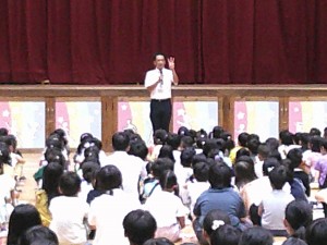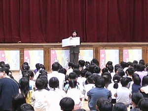 体育館に静かに集合し、校長先生から平和についてのお話を聞きました。